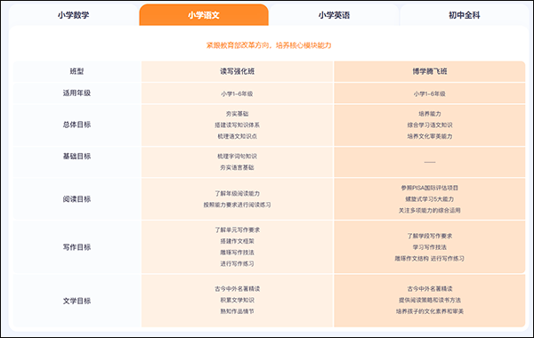 首先猿辅导根据不同的孩子进行了分类,分成了2个班级:读写强化班和博学腾飞班,这两个班级都是针对小学一年级到小学6年级的小朋友,读写强化班的总体目标是夯实基础,帮助小朋友搭建读写知识体系和梳理语文知识点,而博学腾飞班的总体目标则是培养能力,帮助小朋友提高综合学习语文知识以及培养小朋友的文化审美能力,2个班级所针对的目标有些差异。