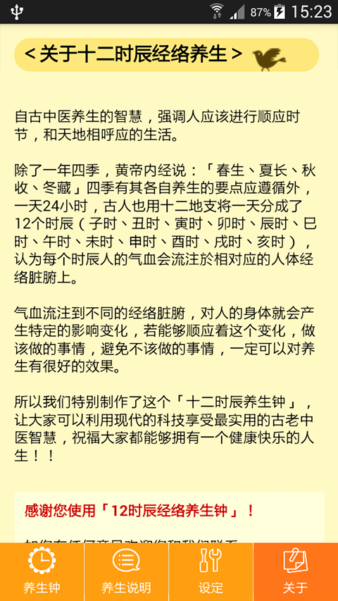 如今我们虽然无法改变社会的生活节奏,但是我们可以调整自己的生活方式,十二时辰经络养生钟APP就是一款养生类健康应用,该软件按照中医经络理论,将每个时辰,现代人在日常生活中该相对应的生活方式,以时钟的方式呈现,可以很好的帮助你养成良好的养生习惯。养生不仅要符合一年四季的变化,还要符合一日十二时辰的规律,养生钟app提供了辰与脏器经络相对应的养生信息,与健康相关的实用性服务,绝对是您培养健康生活方式的随身小帮手,想要拥有一个健康快乐的人生,那就让我们一起学习古人的养生智慧吧。