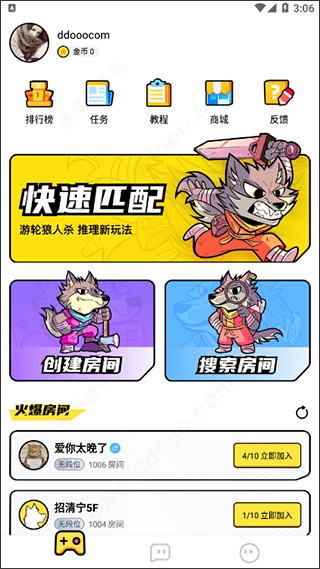 4、另外,在这里主要提供了快速匹配、创建房间、搜索房间多种组局方式,多人在线连麦,玩在一起,乐在一起。