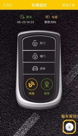 5、检查车辆,如有车辆损坏点击【右下角】验车按钮--拍照上传损伤照片--检查无误后点击【开门】即可用车--如找不到车辆可选择下方【鸣笛】、【找车】按钮
