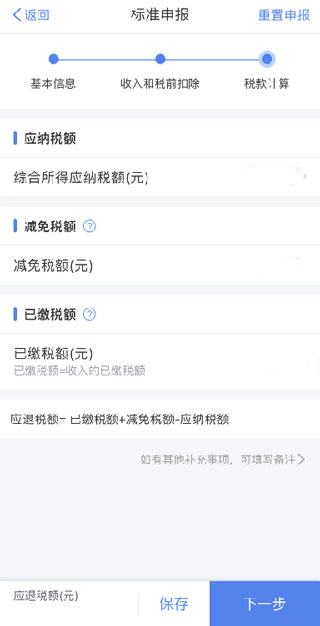 8、最终进入到税款计算页面,这里可以查看到自己综合所得税"应纳税额"以及“已缴税额”,左下角显示的就是你可退/应补的税款。确认无误后点击【下一步】