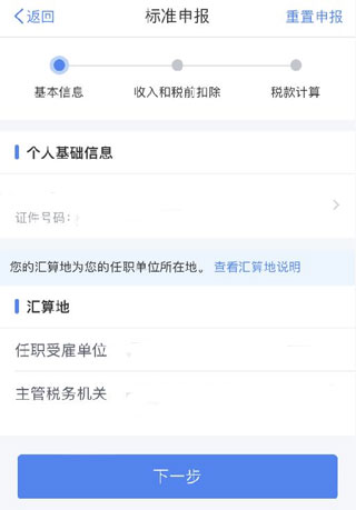 5、进入信息页面,确认自己的身份信息、手鼓单位、主管税务机关和汇算地是否正确,确认完毕后点击【下一步】;