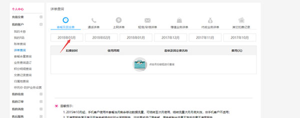 2、进入个人中心,在左边的导航栏中,点开“我的账户”,找到“详单查询”。
