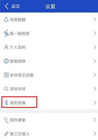 2、点击左上角的图标,进入设置页面,找到【我的设备】,打开手机蓝牙,将手环与APP相互连接;