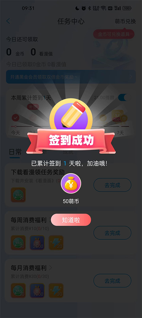 4、之后会来到任务中心页面,完成下列相应的任务可以获得萌币奖励。
