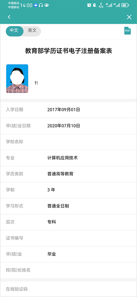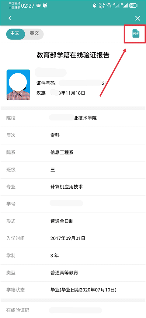 6、最后在学籍在线验证报告中点击右上角的pdf图标,就可以对学籍信息查询报告进行下载打印了