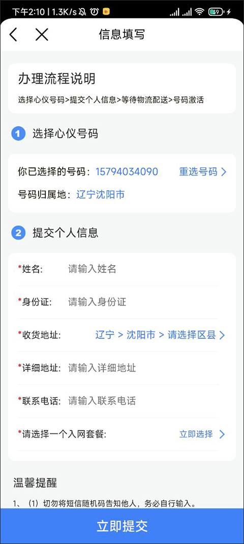 点击后我们需要填写自己的信息、收货地址还有选择办理的入网套餐了,等填写完成后点击提交就可以了,等移动公司后台审核通过后就可以安排物流将手机卡发到大家填写的收获地址的,非常的方便。