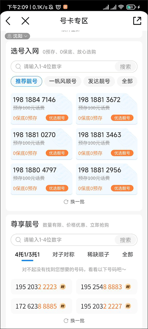 我们进入后可以看见首先映入眼帘的是现在推荐大家办理的最实惠的几个套餐,我们可以先考虑选什么套餐,然后往下滑动,滑动选号入网这个区域,这个时候就需要玩家来挑选自己觉得喜欢的手机号码了,选好了直接点击这个号码就可以了。