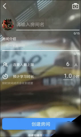 2、随后需要输入房间名称、简介内容,并且设置连麦的人数上限以及预计学习时长,通过底端按钮创建房间。