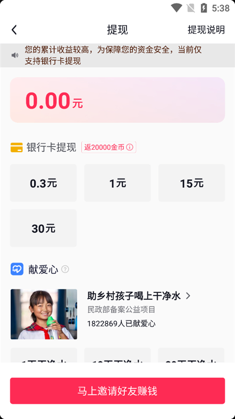 3、邀请好友:在抖音极速版中,成功邀请好友注册,就能获得相对应的金币和现金奖励。最高邀请一个好友可得38元的现金奖励,邀请无上限,非常适合好友多的用户。