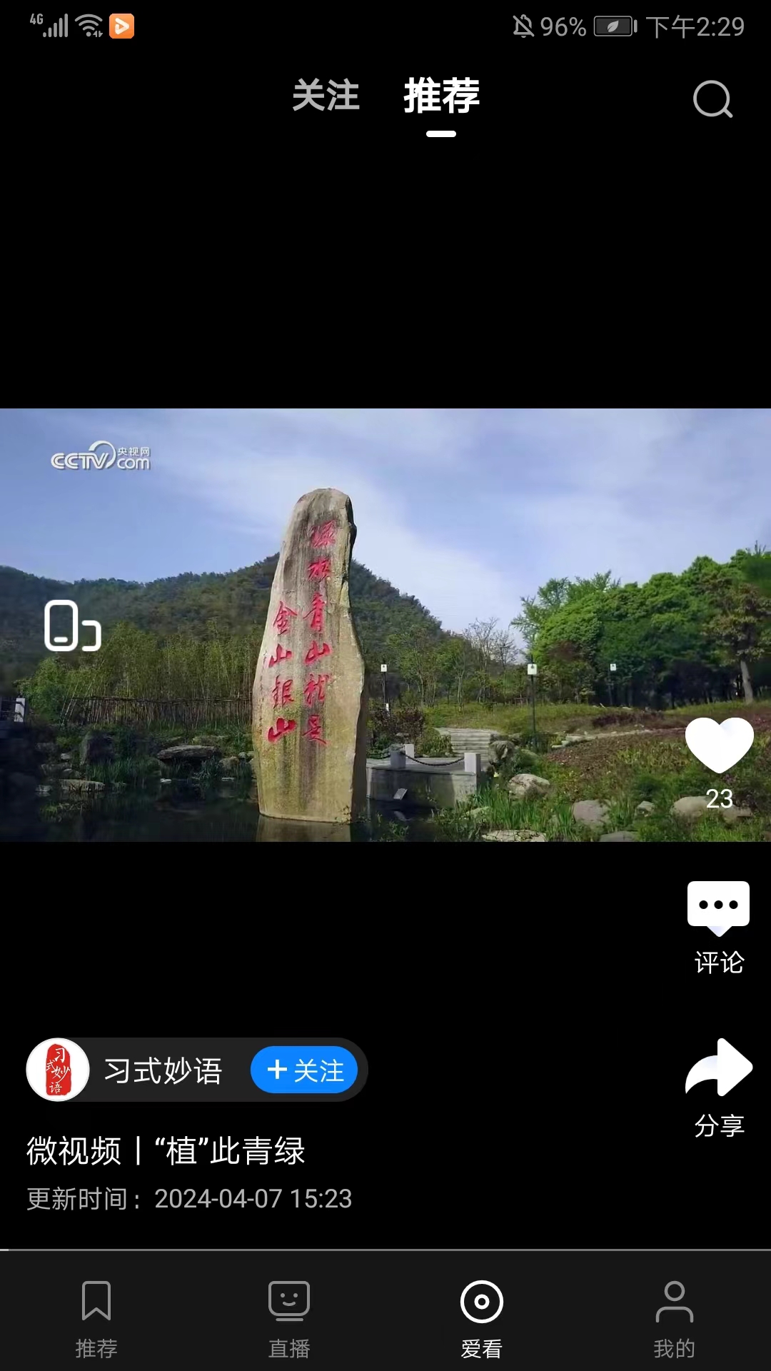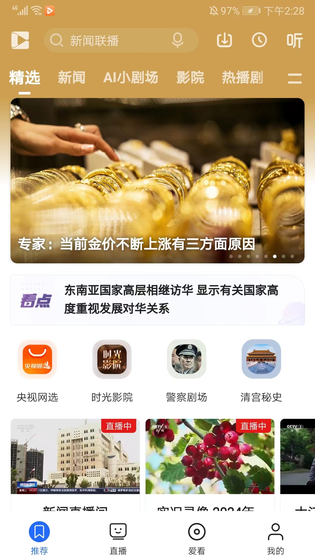 1、打开央视影音鸿蒙版,进入应用主界面,包括推荐、直播、爱看和的栏目,在当前推荐栏目,为用户准备了精选、新闻、AI小剧场影院等丰富的视频资讯,