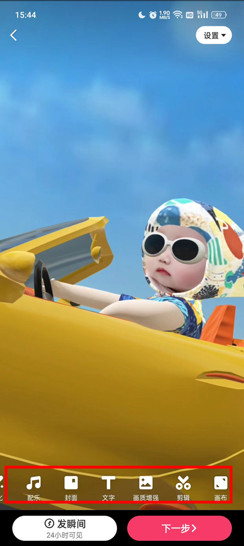 3、你可以选择下方的栏目,进行配乐、添加文字、剪辑等操作;