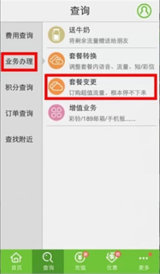 3、选择“套餐变更”点击您想要的套餐即可成功更改套餐。