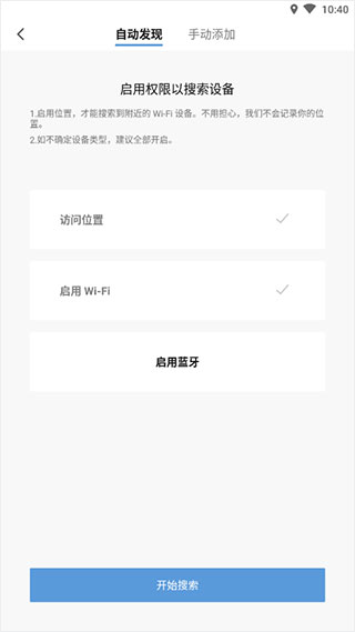 2、方式一自动发现,启动WIFI、蓝牙,点击开始搜索;