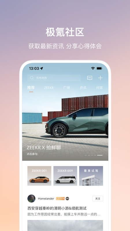 极氪app官方版是一款专门为爱好极氪的粉丝们打造的线上服务平台,主要向用户提供社区、商城和爱车相关功能,其中社区模块支持车主生活、用车体验等内容,商城模块能实现极物商城好物分享、zeeke精品和附件售卖、积分兑换等,爱车模块则可以实现在线下定,做到用户线上体验的可进化。不仅如此,软件是一个非常强大的社区交流平台,每天更新原创文章和网友投稿的内容,提供最新的新能源出行资讯、购车信息,用户可以发布文章、动态,进行互动评论及投票,参与官方的各种主题活动,随时了解多方面汽车内容。极氪汽车app作为一个汽车官方推出的app,不仅打破了最纯粹的用户思维,更是通过极氪模式,不断为用户带来极致出行的全新体验,有需要的用户赶紧来下载吧。