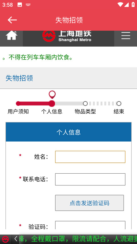 2、点击物品挂失,查看用户须知后,在这里填写个人信息、遗失物品信息后提交即可