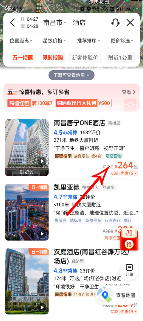 3、查找之后会得到你想要的酒店类型,建议选择离你最近的酒店;