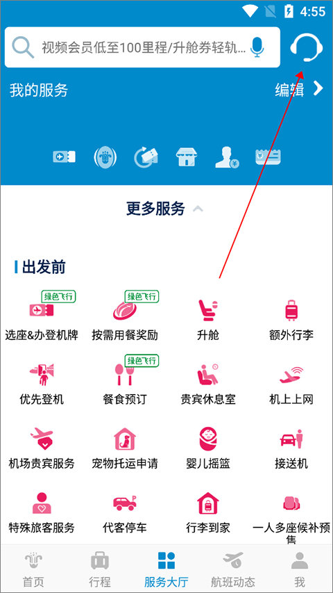 3、可联系【在线人工客服】进行咨询,其操作方式是进入南航app中的【服务大厅】页面中点击右上角的客服图标即可,或直接拨打南航客服电话:95539