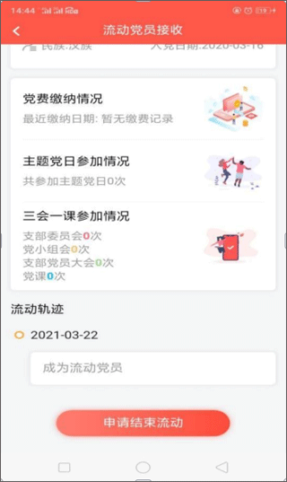 流动党员结束流动时,点击“个人中心”—“流动党员”图标,进入“流动党员接收”功能页面,点击“申请结束流动”按钮,进入“申请取消流动党员”页面,填写取消流动原因,点击“提交申请”,即完成结束流动申请。