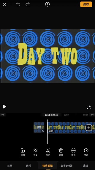 3、在画面右下角可进入编辑界面,在这里你可以调整屏幕比例,也可以更换背景,护着通过分割、删除以及修剪功能剪辑你的视频,期间你还能设置变速效果。修剪完后的视频,可以同各种下面的主题、音乐、以及文字特效和滤镜,创建属于你的视频风格。