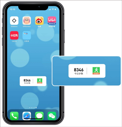 2、在小工具中,找到健康运动计步器步数小工具,按住不放,然后拖到桌面的某个适当位置,松放即可。