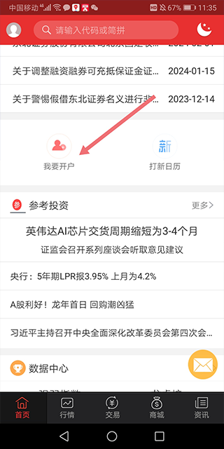 用户登录软件后进入首页处下拉至底部【我要开户】处点击