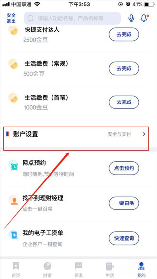 1、打开软件后,首页为常用功能入口和理财产品,点选我的账户;