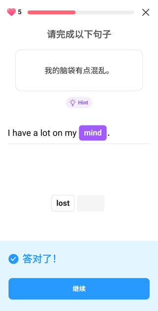 3、每次会给5个句子并用语音播报,记住后点击继续;