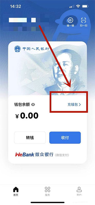 1、在数字人民币首页,选择自己的钱包后点击充钱包选项。