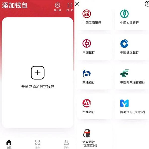 1、注册成功,进入数字人民币安卓app页面后,可看到下方有「首页、服务、我的」三大板块,较此前版本有了功能和分区上的升级,并且 App 在界面设计上更为美观,使用起来更为流畅。接下来,用户可在「首页」中开通或添加数字人民币钱包。