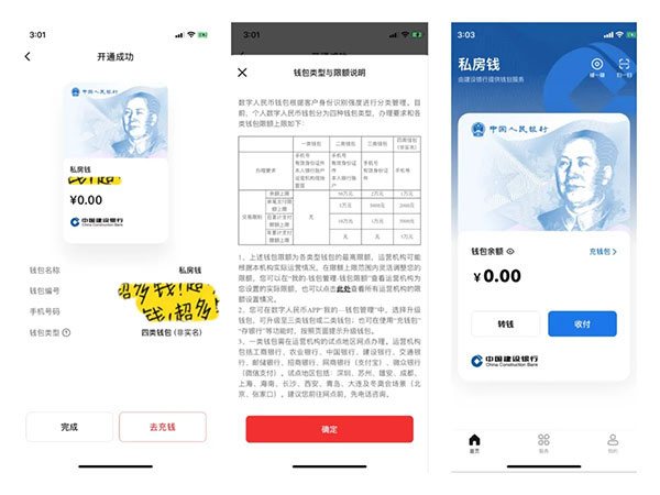 通过应用商店就可下载数字人民币App,新用户注册过程中,无需输入姓名、身份证号、银行卡号等个人信息,仅通过手机号、设置密码、同意相关协议,就可以直接开通匿名钱包,整个过程流畅迅速,数秒内可完成,开通后可按需要升级为实名钱包。钱包设置了四类账户,一类账户什么都不限制,其他三类账户都有限制交易金额。