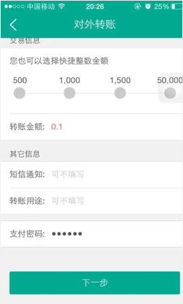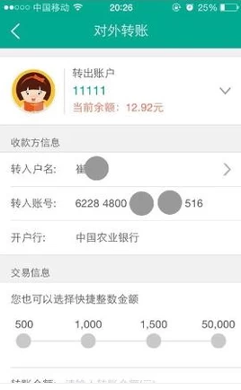 6、操作完成之后回到刚才的菜单,选择对外转账。在对应框输入对应信息即可,在选择银行卡的时候我们可以看到余额,输入密码进入下一步操作;
