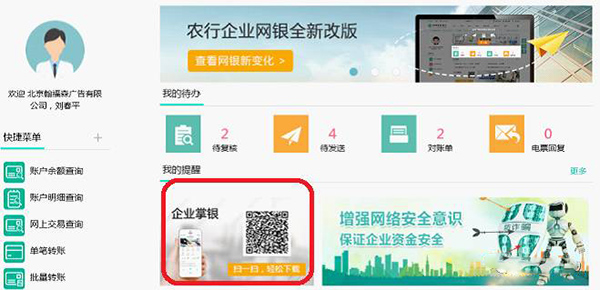 操作员登录企业网银,在首页可扫描二维码下载企业掌银App。
