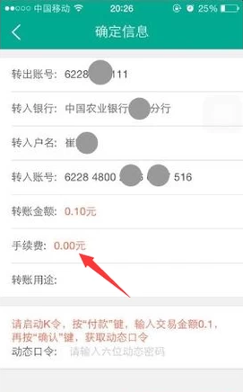 7、在这里我们可以看到手续就是0元了,核对信息后,输入口令卡密码然后确认即可完成转账。