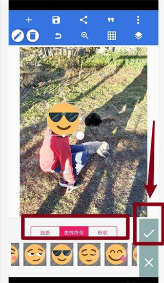 3、点击“表情”,选择您想要加入的表情,放置合适的位置,点√号保存,显得更有趣