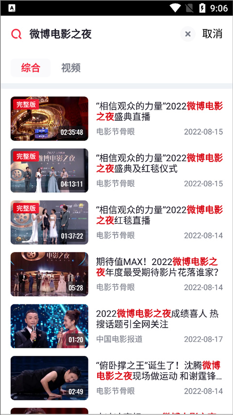2、如果想要回放已经直播完的节目,可以在直播页面中通过顶部的搜索框直接搜索节目即可,例如搜索【微博电影之夜】,就可以在搜索出的节目页面中点击节目进行回话即可