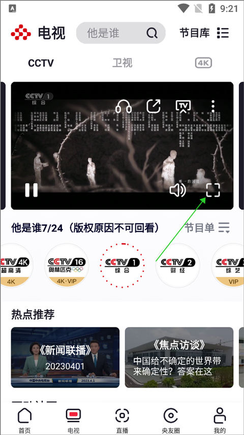 横屏观看方式其实在央视频直播中就是以全屏方式观看,当直播画面进入全屏模式后,播放画面就会自动横屏,其操作方式也很简单,只需要用户进入直播页面后,点击直播画面就会在其右下角位置出现全屏图标(下图绿色箭头所指)