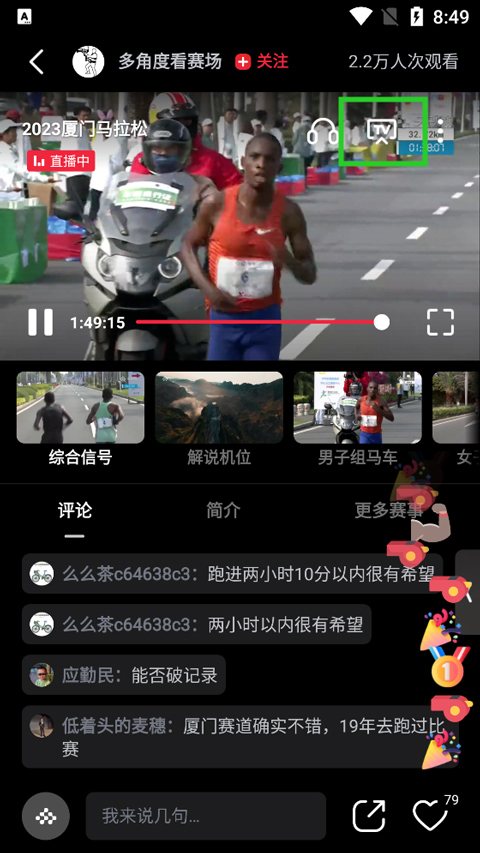 3、然后用户打开手机上的央视频直播画面,点击直播画面后会在右上角位置处出现投屏图标(下图绿色方框区域),用户点击这个投屏图标即可投屏了