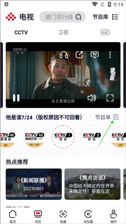 4、如果是想回放电视节目的直播画面,可以在电视直播页面中点击节目单右侧的扩展图标(下图绿色箭头所指)