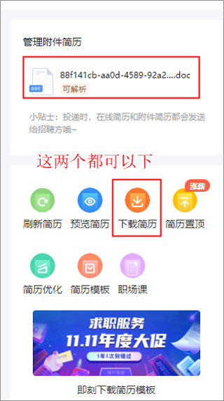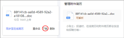 3、右手边可以看到有个管理附件简历,和下载简历,管理附件简历下载的是用户自己上传的简历;下载简历是用户注册时填写的在线简历,这个是可以选择模板的