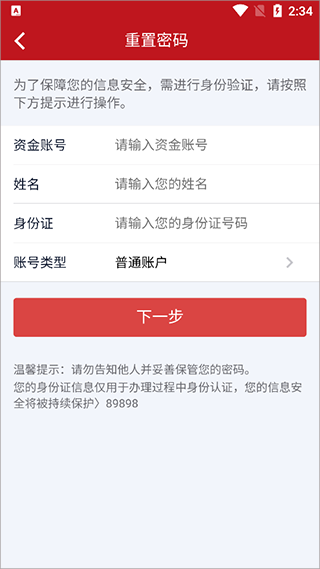 目前app上只提供密码找回服务,没有提供资金账号找回服务