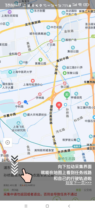 5、进入地图,向下拉动采集界面,就能在地图上看到任务线路和自己的行程轨迹了;