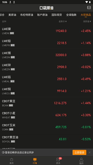 1、用户进入应用后在【行情】页面中即可查看原油行情,其中综合面板中可以看到原油、美元、黄金三者的行情和涨跌关系