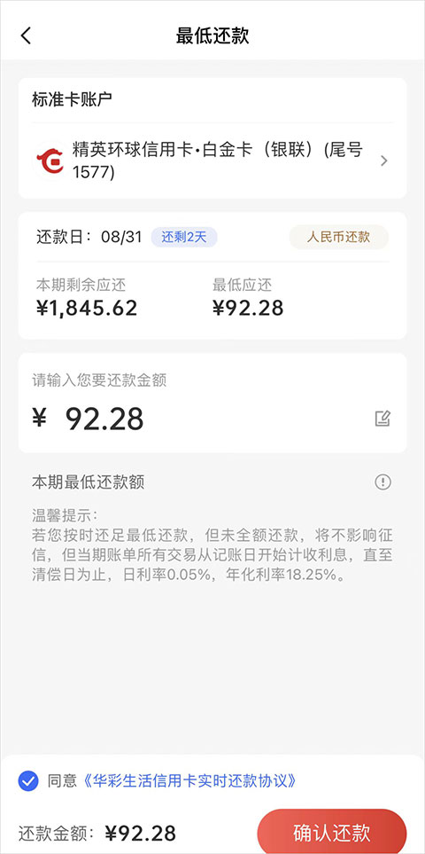 3、进入最低还款页面(系统自动显示最低还款额),点击确认还款即可还款。