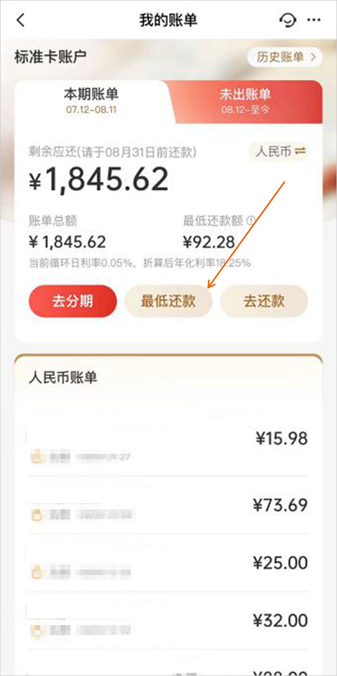 2、接着点击“最低还款”(全额还款只需要在此页面点击“去还款”即可全额还款)