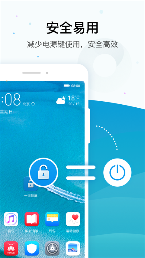 华为一键锁屏app是由华为终端有限公司研发的一款安卓手机锁屏软件,能真正实现桌面上点击一键锁屏图标可以实现快速灭屏,减少手机电源键的使用和延长其使用寿命。用户启动软件即可直接锁屏,释放对电源键的频繁使用。而当软件成功安装后启动,就能在桌面新增一个锁屏快捷方式 ,也可以长按桌面,然后选择快捷方式,即可随时在桌面上实现一键锁屏,为避免电源键因频繁使用而损坏,绝对是必备的安卓软件。另外,华为手机一键锁屏操作非常简单,只需开启手机系统的权限,设置密码,一键点击软件图标,手机就会立马进行锁屏,能够减少手机电源键的使用次数,让手机电源键的使用寿命更长,不过基于安全考虑,仅支持在华为桌面使用,第三方桌面点击不可用。那么有需要的用户快来下载体验吧。