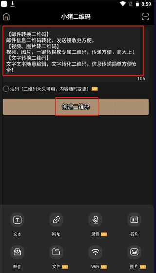 4、邮件、视频、文本、录音、图片、网址、名片等都可以转换成二维码分享;