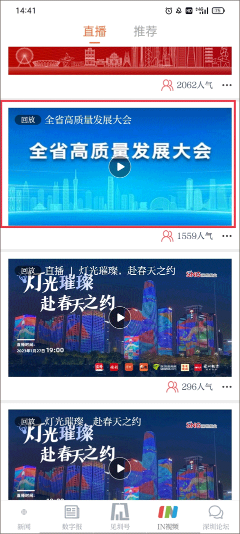 1、在【IN视频】中会有海量的直播回放视频,根据自己的需要来选择观看哪一个;
