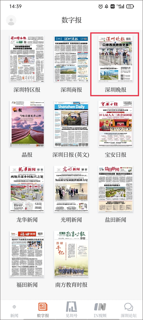 1、选择下方菜单栏【数字报】这个界面,里面有各种类型的深圳数字报,选择想要阅读的数字报类型;