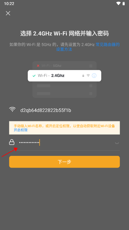 6、在设置网关前要先保证手机和设备处于同一个网络当中,输入WIFI密码并点击下一步。